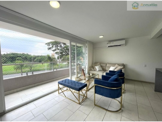 Apartamento ubicado en el segundo piso, con un área de 94 m². Cuenta con una amplia sala comedor con balcón, cocina integral abierta con barra tipo americana, zona de lavandería independiente, baño social y dos habitaciones; la principal con aire acondicionado, baño privado y vestier. Además, dispone de un depósito y parqueaderos dobles.
